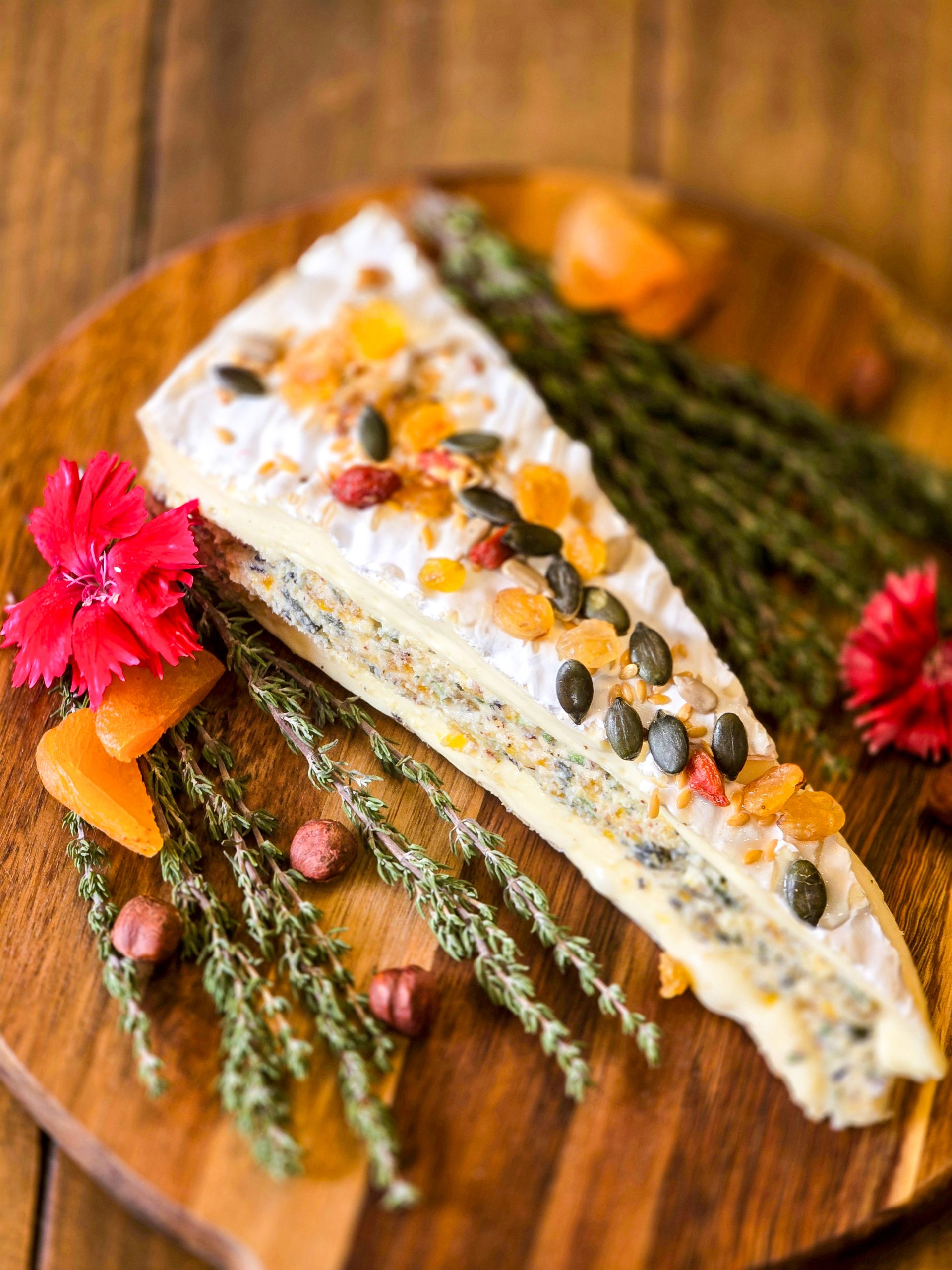 Imaginez une généreuse tranche de Brie de Meaux AOP onctueux, fendue et garnie d’une farce riche et savoureuse. Chaque bouchée est une explosion de textures et d’arômes :